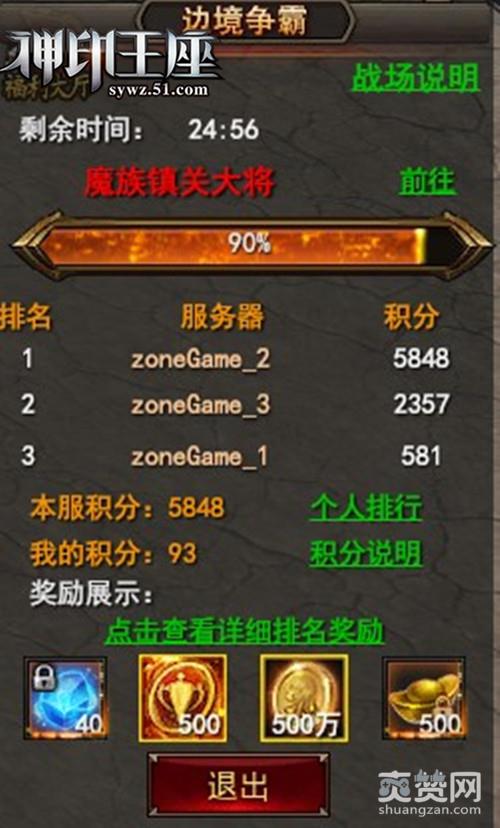 51《神印王座》由同名小说改变而来,其中的经典场景均还原了小说中的场面。在51神印王座中还有一个边境争霸的活动,只有当玩家的等级到达94级之后,才能进入,在该活动中击败魔王大boss之后活动中的几分决定服务器的排行榜以及个人排行榜的名次,接下来就和小编一起来看一下吧!
