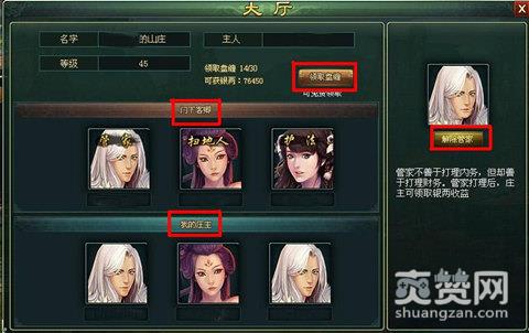 大厅是山庄系统中的一个重要枢纽,其中有三个职位,管家、扫地僧和护法,玩家可以在这里雇佣游戏好友对自己的山庄进行看护。这三个职位的主要职责就是保证离线状态时山庄的正常经营。玩家可以在大厅查看每个岗位的工作状态,还可以领取每日一定量的盘缠。