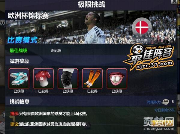 当玩家在37《最佳阵容》达到35级后将开启极限挑战系统,每日会开启不同的极限挑战,纯粹考验阵容搭配的技术,在其中可获得进阶技能材料等珍稀资源。PS:好友租借给自己的球员终于派上大用啦,土豪朋友们请带我飞!
