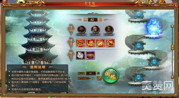 1.打宝塔内总分设100层,不同层数掉落不同珍宝