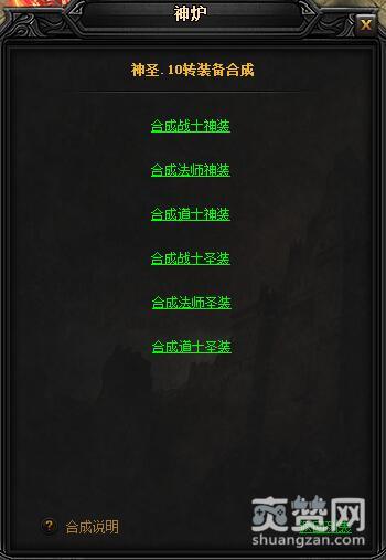 今天我们为大家介绍的主要是神圣·10转装备。打开圣装·10转装备合成,我们会发现其中出现了6项。分别是合成战士神装、合成法师神装、合成道士神装、合成战士圣装(新)、合成法师圣装(新)以及合成道士圣装(新)。