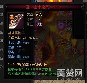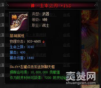 神·主宰之刃。类型:武器,等级:9转,职业:战士。基础属性——物理攻击:933-4665,生命上限:3240(蓝色),暴击:400(蓝色),暴击伤害:1440(蓝色)。捐帮会可得:10800000贡献值,作为附灵材料可获得:7200附灵经验。