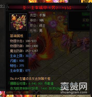 圣·主宰战甲(男)。类型:衣服,等级:9转,职业:战士,性别:男。基础属性——物理攻击:186-933,物理防御:380-1900,魔法防御:253-1267,生命上限:3037(蓝色),闪避:600(蓝色),韧性:375(蓝色),生命恢复:675(蓝色)。捐帮会可得:8640000贡献值,作为附灵材料可获得:5400附灵经验。与神装相比,圣装多了蓝色的闪避属性,同时捐帮会可得贡献值也提升了25%。