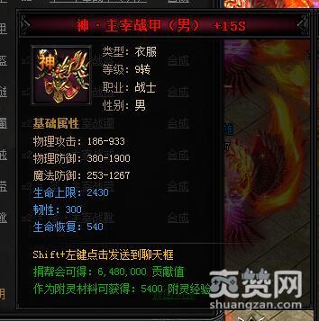 神·主宰战甲(男)。类型:衣服,等级:9转,职业:战士,性别:男。基础属性——物理攻击:186-933,物理防御:380-1900,魔法防御:253-1267,生命上限:2430(蓝色),韧性:300(蓝色),生命恢复:540(蓝色)。捐帮会可得:6480000贡献值,作为附灵材料可获得:5400附灵经验。