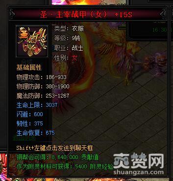 圣·主宰战甲(女)。类型:衣服,等级:9转,职业:战士,性别:女。基础属性——物理攻击:186-933,物理防御:380-1900,魔法防御:253-1267,生命上限:3037(蓝色),闪避:600(蓝色),韧性:375(蓝色),生命恢复:675(蓝色)。捐帮会可得:8640000贡献值,作为附灵材料可获得:5400附灵经验。与神装相比,圣装多了蓝色的闪避属性,同时捐帮会可得贡献值也提升了25%。