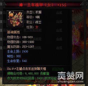 神·主宰战甲(女)。类型:衣服,等级:9转,职业:战士,性别:女。基础属性——物理攻击:186-933,物理防御:380-1900,魔法防御:253-1267,生命上限:2430(蓝色),韧性:300(蓝色),生命恢复:540(蓝色)。捐帮会可得:6480000贡献值,作为附灵材料可获得:5400附灵经验。