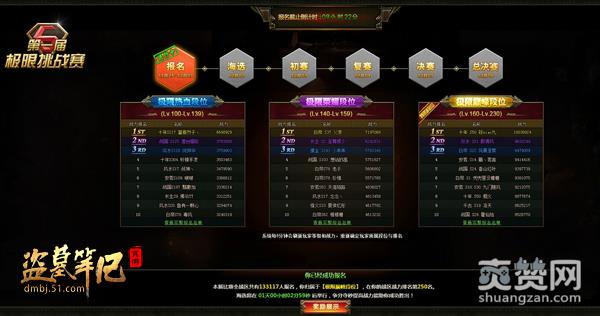 在这个群雄四起,诸侯争霸的盗墓纪年里,欲想登高而呼称霸九门武林,除了敢于接受挑战,熟练的技巧和对时间的把控能力也是致胜的关键所在。各赛事可晋级的人数有限,其中,晋级决赛的选手名额仅设32人,进入总决赛的人数仅为4人。三个段位冠亚季军均决出后,正式结束本届比赛。届时将开启冠军膜拜功能。除了晋级奖励外,成功进入指定排行的玩家,还可以领取绝版称谓,双龙坐骑、专属时装等极限挑战荣耀。