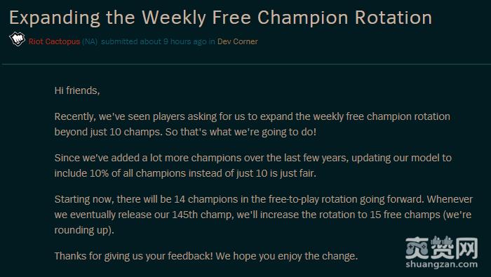 “从现在起,周免英雄的数量会增加到每周14位。而在我们放出第145位英雄后,我们会将这个数字提升到15(四舍五入)。”
