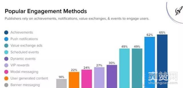 在被调查的发行商当中,有71%的人表示他们使用三种以上的方法维持用户参与度,成就、推送通知和价值交换广告是提高用户参与度最好的方法,70%的发行商表示推送广告是很高效的,65%的发行商表示,通过VIP等级的方式奖励玩家也是带动玩家参与度非常有用的手段。