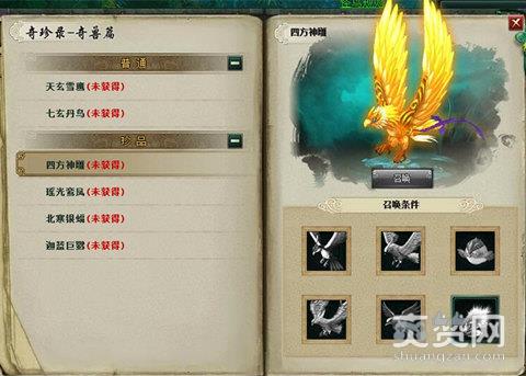 要说到怪鸟系统,不得不提里面的奇珍录。翻开奇珍录,我们可以看到6种传说中的鸟类,其中分为普通和珍品。异兽品种稀缺,合成难度较大,需要多种珍惜鸟类合成获得。异兽不仅在外形上更加炫酷华丽,在战斗状态中也会表现得更为敏捷,是高阶玩家们的宠儿。