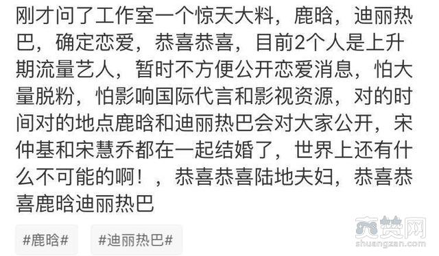 于此同时还传出迪丽热巴与鹿晗确定恋爱的消息,暂时不会公开,大家觉得可信度有多少?CP粉会开心吧,在《跑男》中两个人有很多画面确实很甜。