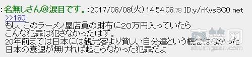 如果这个拉面店店员的钱包里有20万日元,他就不会偷钱了。20年前,日本从没有过自己比游客还要穷的概念。如果日本经济没有衰退就不会发生这样的犯罪事件了。