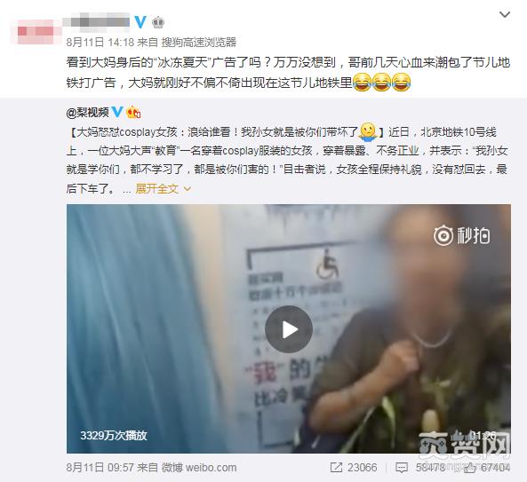 背后的广告主也在官微转发这条新闻,还调侃称“看到大妈身后的‘冰冻夏天’广告了吗?万万没想到,哥前几天心血来潮包了节儿地铁打广告,大妈就刚好不偏不倚出现在这节儿地铁里。”