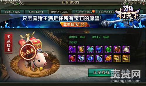 51《范伟打天下》首创的身价系统,一改传统页游中战斗力制霸的颓势,小伙伴可以通过游戏将自己打造成身价千万的大土豪,平时无法企及的梦想或许就可以在游戏中圆梦噢,那么如何才能快速提升身价呢?就像范伟老师击败了一路的高手才最终称帝,游戏中也是要对付击败各种BOSS,以此刷出更高级更强力的装备来增加自己的战力,小编在这里强力推荐各位小伙伴可以去挑战世界BOSS中的特殊BOSS——宝藏猪王,只要10000身价便可进入,击杀宝藏猪王掉落的奖励可以说是全游戏中最丰富的,不仅有各类高级宝石,更有可以开出橙装的黄金宝箱额外掉落哦!