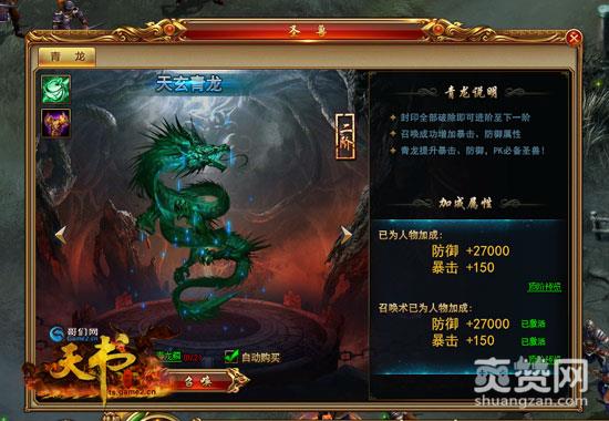 哥们网《天书世界》的圣兽系统,玩家解除封印、召唤青龙,即可得到海量的防御和暴击属性加成。而且,青龙等阶越高,为玩家带来的属性加成越多。