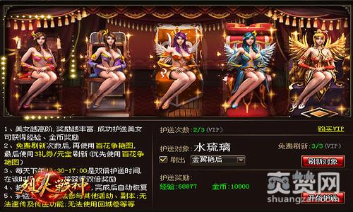 世上美女千千万,环肥燕瘦各有所爱,不管你是萝莉控、御姐控还是什么混乱控,等待英雄勇士来护送的美女还是被分为了五个等级,级别越高,奖励也就越丰厚。如果大家有幸护上了橙色品质的金翼艳后的话,艳后纤纤素手一挥,甚至能够给予大家九十万的经验和四万的金币,真是春风一度,销魂无限。