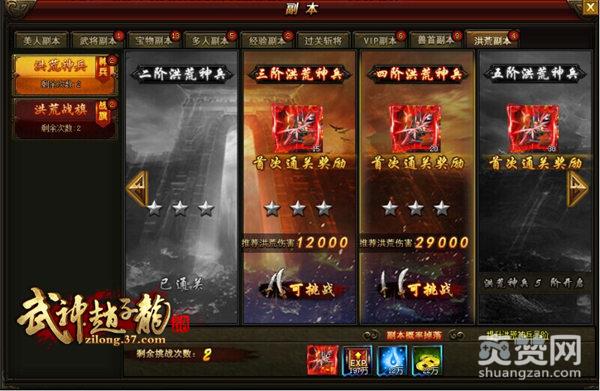 在37《武神赵子龙》的洪荒副本中,玩家每日可以免费挑战2次,顺利通关后则可以进行扫荡,该副本有分难度等级,分别为1-10阶,玩家可以根据自身的实力,对洪荒神兵的进阶等级进行挑战,通关的奖励会随着副本的等级越高而获得越多的奖励。