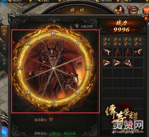 战纹分为九尾、血翼、魔尊、地心、百鬼五个等级,每个等级按八卦分为乾、坤、震、巽、坎、离、艮、兑八个部位碎片,只有集齐每个等级的八个部位碎片,才会激活相应的战纹套装属性。每个战纹碎片均有6条随机属性,通过战纹洗练功能,可以获得不同的星级属性,战纹碎片属性分为:火攻击、火防御、冰攻击、冰防御、雷攻击、雷防御、生命上限、魔法上限、受战士伤害减免、对战士伤害增加、受法师伤害减免、对法师伤害增加、受道士伤害减免、对道士伤害增加等。