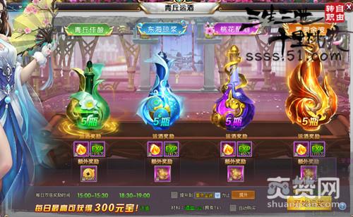 51《三生三世》是一款画质优美的游戏,建号就能体验三种角色:近攻、远攻以及医生。游戏内也有多种活动可以赚取绑元,今天我们就来看下之一的青丘运酒!51《三生三世》青丘运酒有4种不同的酒,奖励也是不同的,酒越高档奖励越多,每日最高获得300元宝。升级酒的品质需要“酒曲”(日常活动、商城购买获得,商城售价3元宝1个),青丘佳酿晋升东海琼浆需要2个酒曲,东海琼浆到桃花醉酒需要4个酒曲,桃花醉酒到墨灵金波需要6个酒曲。每日双倍时间:15:00-15:30 18:30-19:00