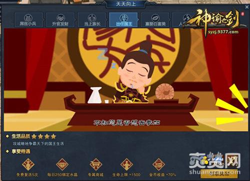 9377《神谕之剑》天天向上一共分为“屌丝小兵”、“升官发财”、“当上族长”、“出任国王”、“赢取白富美”和“人生巅峰”等6个阶段。