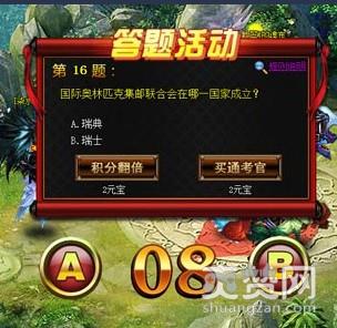 在14:00-14:15时,会对30级以上玩家开放答题活动,共有30个问题,每个问题分为A、B两个选项,每答对一道题就能获得一定的积分,右下角为积分高低的排名,完全与战力无关,即使是战斗力为五的渣渣,也可以成为答题活动最耀眼的新星!