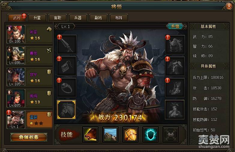 1级状态下,如果你把战斗科技里的盾兵科技都点满,再把所有武器都神铸到神级武器,兵器也全满,带副将大乔的话,1级的孟获战力可以达到487356。如果你没有给孟获携带任何武器,若是卸掉所有的武器,那么孟获的战力就只有230174。上图是全兵器全神武带副将大乔时和什么都不带的数据,可以借鉴一下。