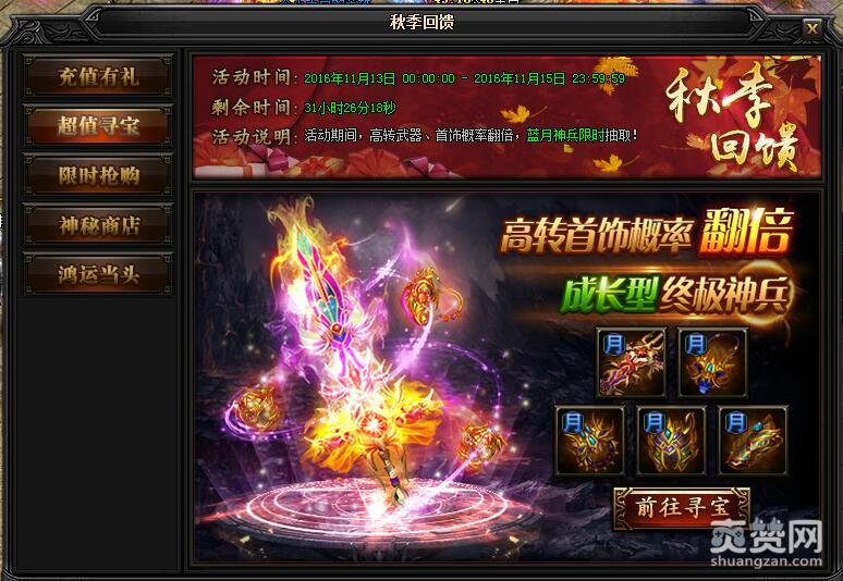最近,XY游戏《蓝月传奇》推出了一项超值秋季回馈活动。在这些秋季回馈活动中,又细分为充值有礼、超值寻宝、限时抢购、神秘商店以及鸿运当头等小内容。今天要为大家讲解的是其中最受瞩目的一项内容——超值寻宝。在活动期间,高转武器、首饰概率翻倍,蓝月神兵限时抽取!高转首饰概率翻倍,成长型终极神兵!