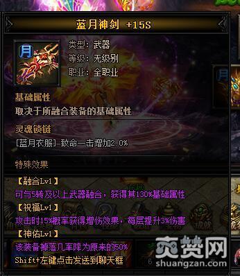 蓝月神剑。类型:武器,等级:无级别,职业:全职业。基础属性——取决于所融合装备的基础属性。灵魂锁链——【蓝月衣服】致命一击增加2.0%。特殊效果:【融合Lv1】可与5转及以上武器融合,获得其130%基础属性。【祝福Lv1】攻击时15%概率获得增伤效果,每层提升3%伤害。【神佑Lv1】该装备掉落几率降为原来的50%。