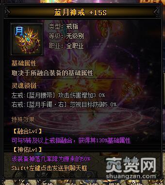 蓝月神戒。类型:戒指,等级:无级别,职业:全职业。基础属性——取决于所融合装备的基础属性。灵魂项链——左戒:【蓝月腰带】攻击伤害增加3.0%,右戒:【蓝月手镯·右】忽视目标防御5.0%。特殊效果——【融合Lv1】可与5转及以上戒指融合,获得其130%基础属性。【神佑Lv1】该装备掉落几率降为原来的50%。