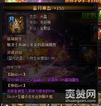 蓝月神盔。类型:头盔,等级:无级别,职业:全职业。基础属性——取决于所融合装备地基础属性。灵魂锁链——【蓝月武器】人物生命增加3.0%。特殊效果:【融合Lv1】可与5转及以上头盔融合,获得其130%基础属性。【神佑Lv1】该装备掉落几率降为原来的50%。