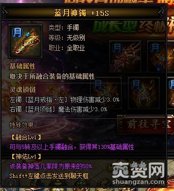 蓝月神镯。类型:手镯,等级:无级别,职业:全职业。基础属性——取决于所融合装备地基础属性,灵魂锁链——左镯:【蓝月戒指·左】物理伤害减少3.0%,右镯:【蓝月项链】魔法伤害减少3.0%。特殊效果:【融合Lv1】可与5转及以上手镯融合,获得其130%基础属性。【神佑Lv1】该装备掉落几率降为原来的50%。