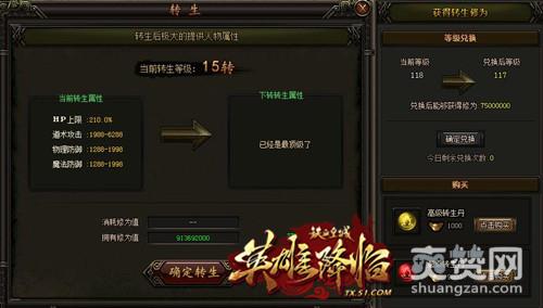 对于51《铁血皇城》的老玩家来说,转生并不是一个陌生的玩法,但是每每说到转生,却是让众多玩家面露为难之色,虽说转生之后可以带来大量的属性加成,但是好不容易拼命转到12转,如今又开放15转,真是要挂机挂到地老天荒啊!别急啊,虽说人物等级达到100级后可以通过降低自己的等级来兑换转生修为,可是每天只能兑换3次,也是醉醉的;要是你和小编一样心急倒是有一个方法可以省事儿不少,通过商城购买转生丹只要双击一下,那经验就如坐了火箭一般蹭蹭蹭的往上涨,至于是买高级转生丹还是超级转生丹,各位老板就要量力而为啦!