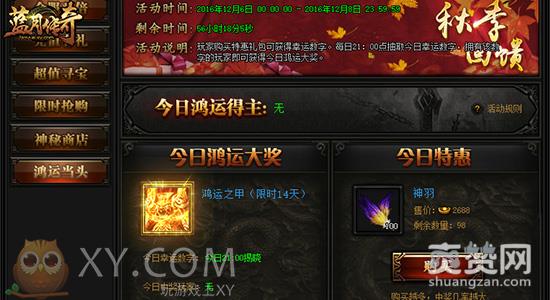 超值寻宝和限时抢购这两项是这次回馈活动的重中之重!开启寻宝历程,获得高转武器和首饰概率翻倍,还有一定的几率获取蓝月神兵!若你寻宝能够寻到神兵利器,那么你的输出就能够成倍上升,在PK竞技中笑傲群雄,轻松称霸XY游戏《蓝月传奇》!而限时抢购也是一个能够让你快速提高战力的活动,一些稀有非卖品限时出售,如果不能把握住此次机会,那么你就可能会被别人远远的拉开差距哦!