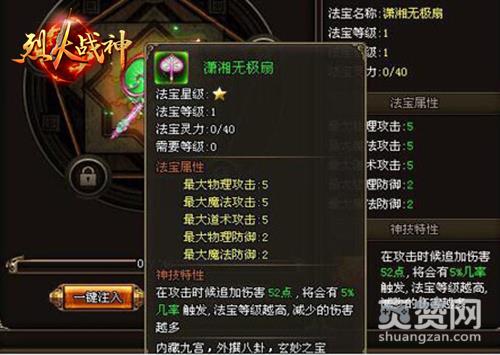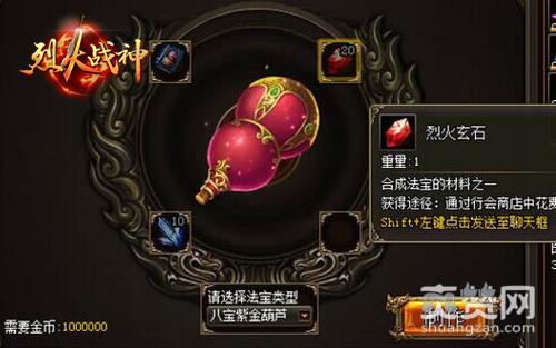 在51《烈火战神》中,法宝是杀人越货必备的道具。而且法宝不仅能增加大家的最大攻击、防御,它还有一个最大的特点就是具有独一无二的特性技能。大家可以合成3种不同的法宝,合成法宝需要获得20个烈火玄石、10个天地结晶以及一个图谱和100W金币。