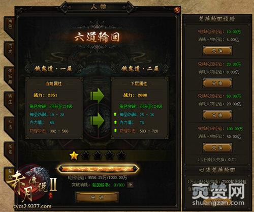9377《赤月传说2》六道轮回除了天神道之外,其他五道都分为5层,每提升一层都能提升大量属性和战力。玩家提升了六道轮回等级后可以提升人物等级上限,新版本玩家可以升到高至132级。