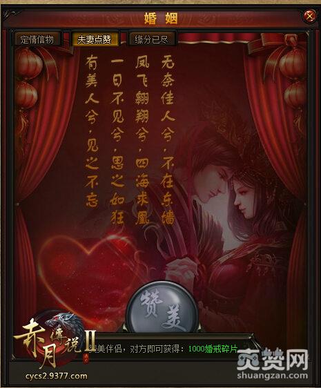 9377《赤月传说2》新资料片上线后,婚姻系统内将新增夫妻点赞功能,玩家结为伴侣后次日即可赞美自己的伴侣。被赞美的玩家可通过有奖领取到1000枚婚戒碎片,夫妻之间可以互相赞美领取奖励哦。哎哟妈呀,又是个虐单身狗的玩法呢,我失散20年的女票到底在哪啊啊啊啊~!!