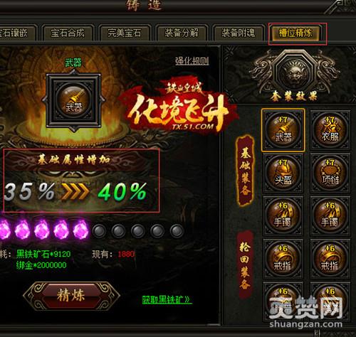 当我们获得矿石,在存足金币,那我们可以开始精炼槽位来获得强力的属性,而槽位也分为基础装备槽位和轮回装备槽位,所有槽位精炼每一级都有相应属性的增幅,当基础和轮回的精炼统一升级到一定的等级还会激发套装精炼效果。