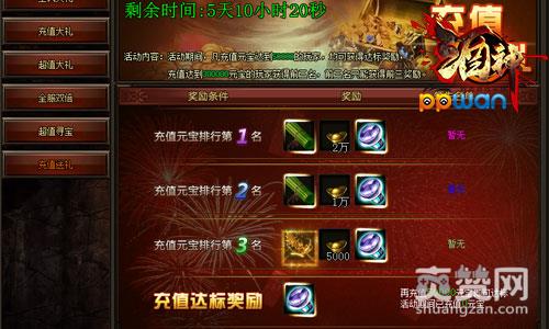 充值大礼:活动期间,凡玩家每天累计充值2000元宝均可领取由传说宝箱、3888荣誉*10、BOSS讨伐令*10、引魂卷轴*20威望令(小)*5组成的充值大礼一份!另为在活动期间,玩家累计50000元宝还可以获得五阶复活戒指一份,前三名还有超大礼包相送!