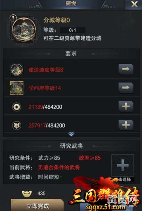 如果你想要建设分城,首先你必须要研究分城科技。分城科技需要等到学问府14级才可以学习的,而且必须派遣武力和统率都高于85的武将进行研究。一般都是开服签到七天等游戏送个赵云,土豪直接买个吕蒙就搞定了。还有另一招,开服活动会送公孙瓒,完成任务集齐80个碎片合成,但是需要武力+2的绿剑宝物。