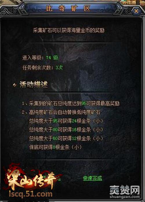 所以说,采集到的矿石总纯度达到95后,才能够获得至高奖励。玩家可以通过点击快速完成按钮,并消耗200元宝,来完成1次比奇矿区。ps:快速完成便能直接双倍领取最高奖励,获得:金条(小)*48。