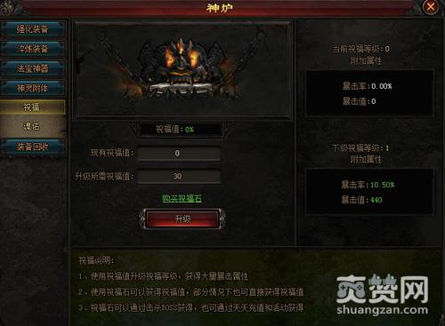 祝福一共有十二个等级,玩家想要升级祝福,必要消耗一定的祝福值。祝福可以给玩家带来大量的暴击率和暴击值。要知道,祝福的等级越高,带来的加成也就越高哦!