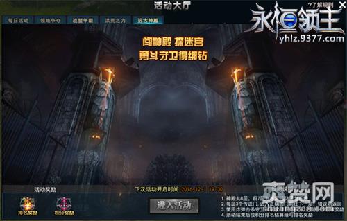 9377《永恒领主》新版本当中的“远古神殿”活动玩法将会在每天晚上的19:30 - 19:45开启,所有等级达到1转或者以上的领主均可以通过活动大厅参与。另外,温馨的提醒放到前面说,“别见着人、怪或者BOSS都要炸上一遍,把他们都炸惹毛了虽然很好玩,但是结局也会很悲惨。众怒难犯,切记!!!”