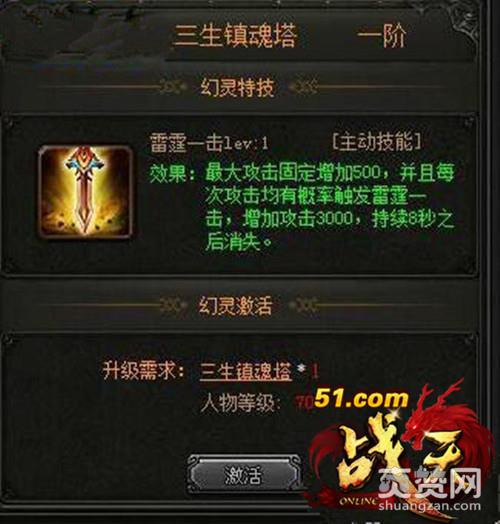 51《战天》中的三生镇魂塔是一种极品幻灵,成功激活三生镇魂塔,可以最大固定攻击增加500,并且每一次攻击有一定的概率触发雷霆一击。另外还可短时间内增加大量攻击力,让你的伤害瞬间爆发!