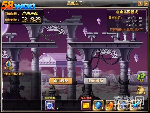 58wan《冒险世界》的冒险者们,做好准备就让我们加入这场抵抗恶魔之旅吧!冒险大陆的裂隙有恶魔出没,为了中洲大陆的和平拿起武器击杀这些恶魔吧!恶魔之门分为自由匹配和限时活动两种模式,不同的时间开启不同的模式,击杀恶魔可以获得大量奖励,不过参与恶魔之门需要恶魔券。
