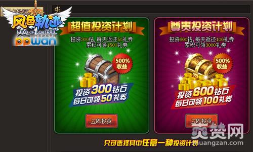 虽说理财有风险投资需谨慎,但是这一国际惯例在ppwan《风色轨迹》中却不适用。ppwan《风色轨迹》月卡投资计划,不管是超值投资还是尊贵投资,皆是500%收益,稳赚不赔。但是投资虽好,可不能贪心哦,玩家只可选择其中任意一种投资计划进行投资,主要区别就在于投资的多少,就看你怎样选择!