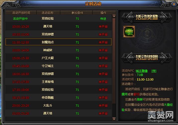 1、在游戏当中,封魔泡点活动每天11:30-12:30定时开启,于活动期间,玩家在城主雕像附近挂机将持续获得经验加成,不同等级的玩家每10秒所等到的经验数量是不同的;