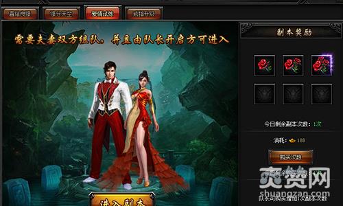 打开喜结良缘的爱情试炼页面,可以夫妻双方共同进入试炼副本,掉落婚戒的升级材料。每天可进入一次,掉落大量玫瑰花。