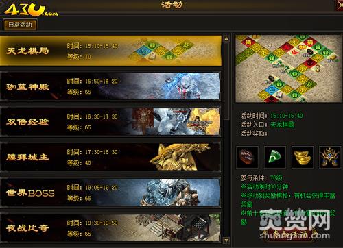 年轻必须有激情呀!43u《龙魂沙城》特别的为小伙伴们设定了激情玩法,休闲的天龙棋局可使带领小伙伴们重返孩童时代,激情的闭关活动玩的就是速度,丰厚掉落的激情神殿可是掉落丰厚,欲知详情就一起来看看吧!
