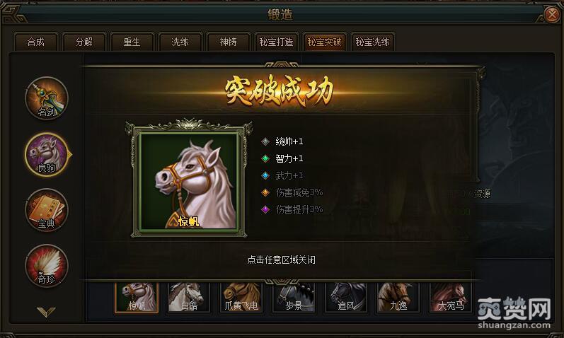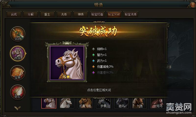 今天我们先依次选择锻造-秘宝突破-良驹-第一匹良驹惊帆,进行突破吧。