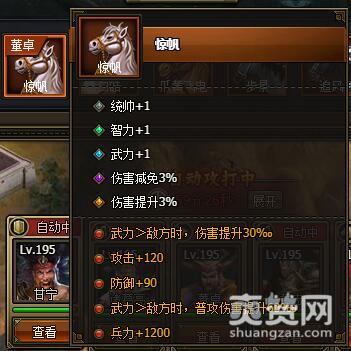 至此为止,突破全部完成。我们细细观察后发现,这匹良驹有三个属性增加的被动技能,所以受用范围要比别的良驹广些。而且剩下的两个被动技能一个有防护作用,一个有进攻意识,都是非常赞的技能。总体来说,虽然这匹良驹和特殊良驹蚩尤象龙相比差了下,但在普通良驹是非常出众的。因此,这匹良驹适合我们首发阵容的五人任意一人使用。这里小编是给董卓使用,大家也可以根据情况选择别的良驹,董卓由于武力偏高,所以应该这样洗: